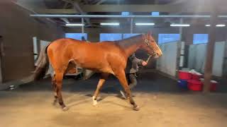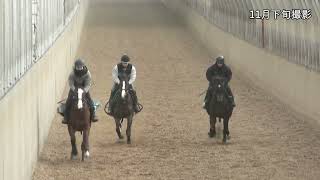 ■馬体重:488kg(先月比 +6kg) 年末年始のリフレッシュ期間を経て順調に調教が進んでいます。現在は屋内坂路コースで1ハロン16秒ペースでの調教を行っています。 調教時にしっかりバランスをとって走れている点は好印象で、また体力面も豊富で余力を持って調教をこなせています。質の高い運動を積み重ねていることで、筋肉の隆起も見えるようになってきました。飼葉喰いが落ちることなく、気性面も特に気になるところはありません。 今後はタイミングをみてペースアップを図る予定にしており、そのなかでさらにベースを高めていきます。 ※本動画は2025年11月下旬撮影 ※隊列左側、動画冒頭で矢印が付いている馬が本馬です